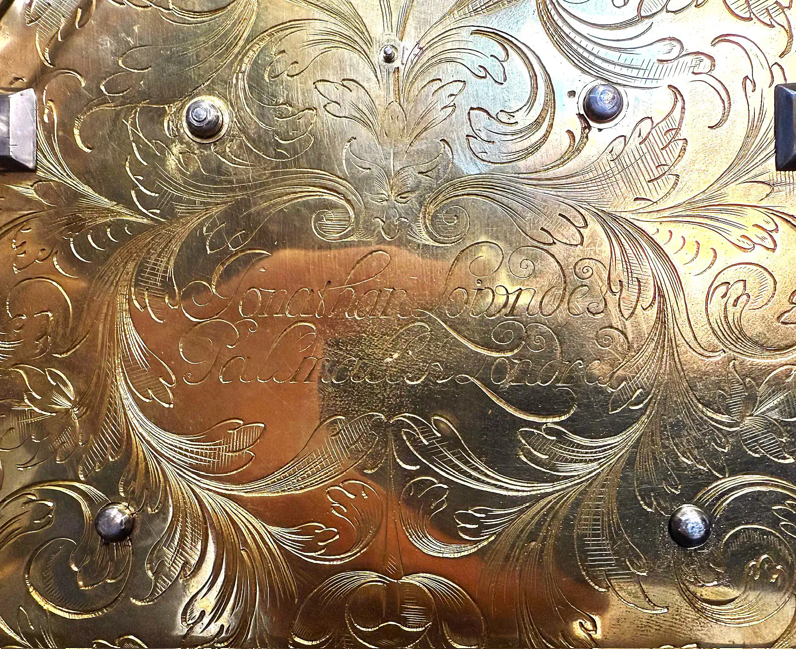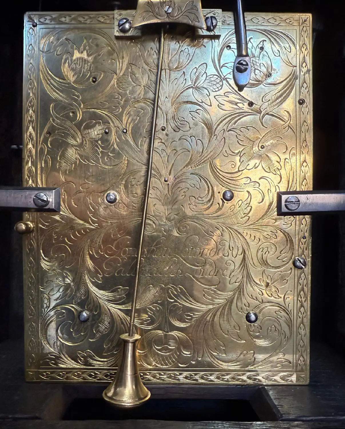 The striking eight-day twin fusee five pillar brass movement has a verge escapement with a short knife-suspended pendulum. The striking, which is regulated by an internal rack, indicates the hours fully on a bell. The backplate is profusely engraved in an unusual period style around a unusual signature cartouche with the maker’s name: Jonathan Lowndes à Londres. The movement has pull-quarter repeat on one bell for the quarters and the other bell for the hours.