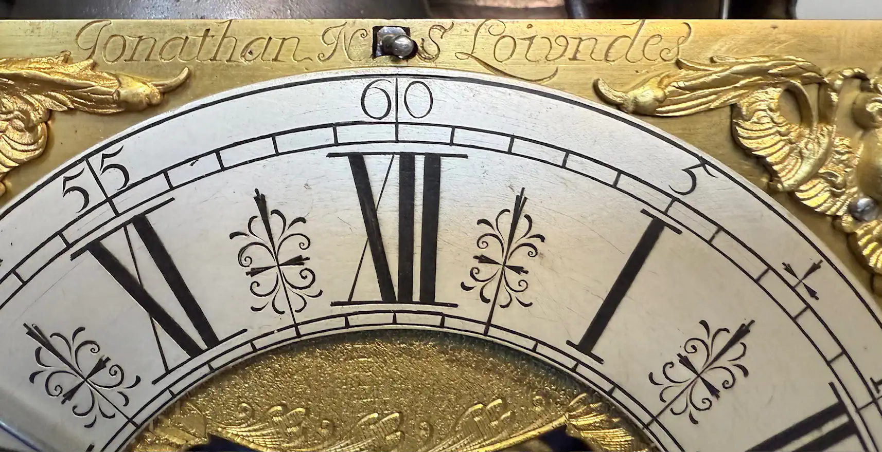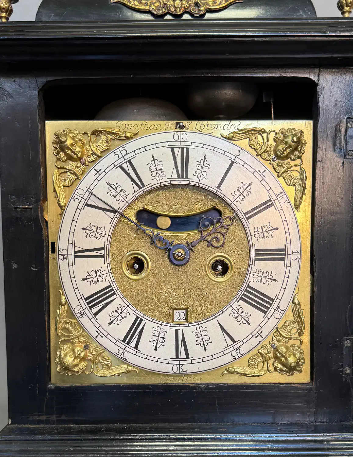 The maker Jonathan Lowndes was born around 1656 at Knutsford, Cheshire. a free brother of the Worshipful Clockmakers Company in 1680. There is quite a lot known about him, but not whom he was apprenticed to. He took several apprentices himself. He was active until 1702, maybe even to 1710.