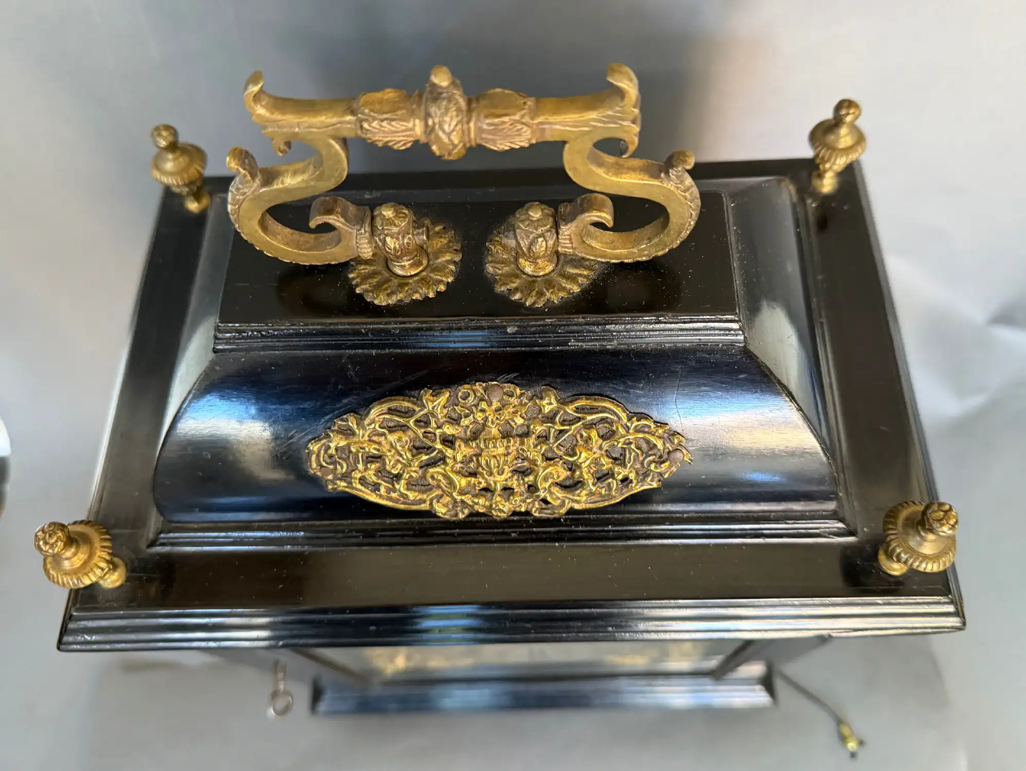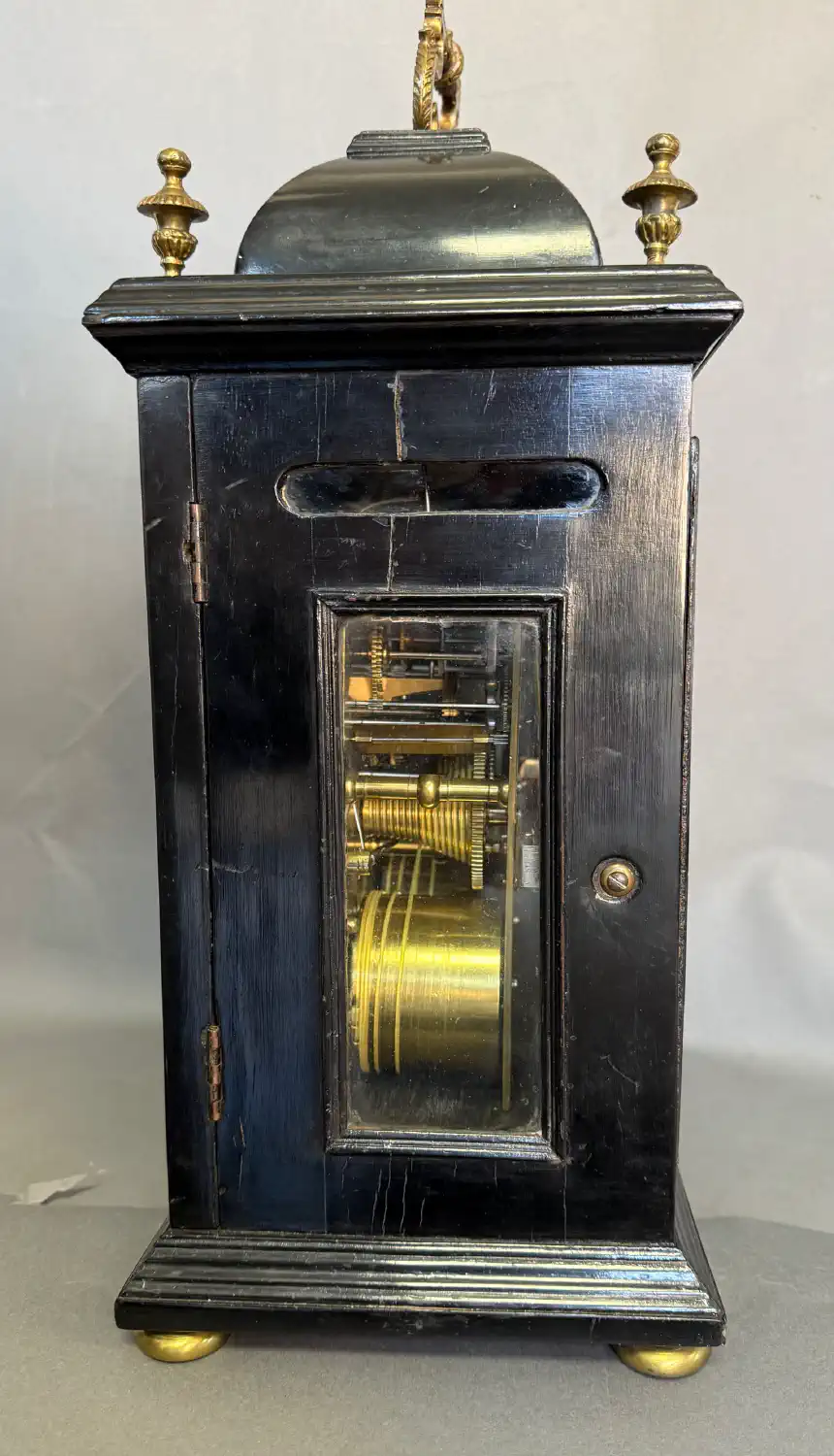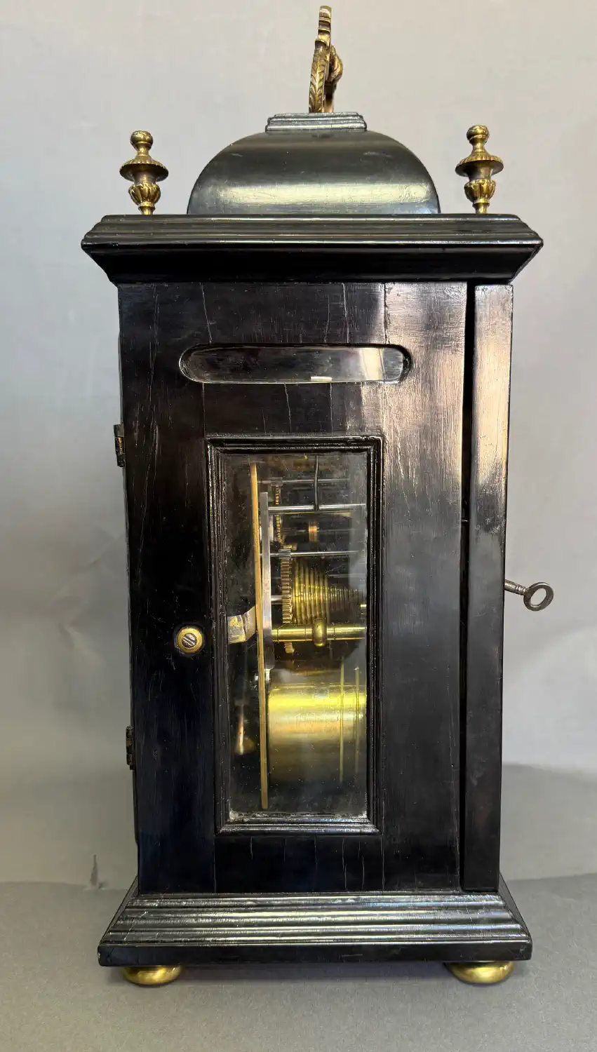 The well-proportioned ebony-veneered oak domed top case has rectangular viewing windows to the sides so that the movement is almost entirely visible. The dome is adorned by a pierced ornament, whilst at the top of the door there is a pierced gilt brass strip, which functions as a sound fret. The case rests on four gilt brass bun feet.