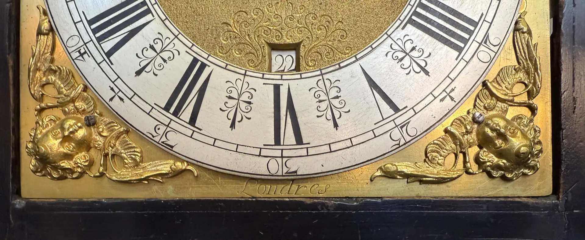The fine square brass dial has a matted centre and ringed winding holes. There is a date aperture above the VI and a strike/silent lever above the XII (N/S), flanked by the name of the maker: Jonathan Lowndes. This is matched by the engraving at the bottom of the dial: Londres. Below the XII is a false pendulum aperture. The dial has an applied silvered chapter ring and winged cherub-head spandrels in the corners. The chapter ring is engraved with a narrow outer minute ring within there are Arabic five-minute numerals, a central ring with Roman hours I-XII and extremely pronounced half-hour markers and an inner ring divided into quarter hours. The time is indicated by a pair of pierced period blued steel hands.