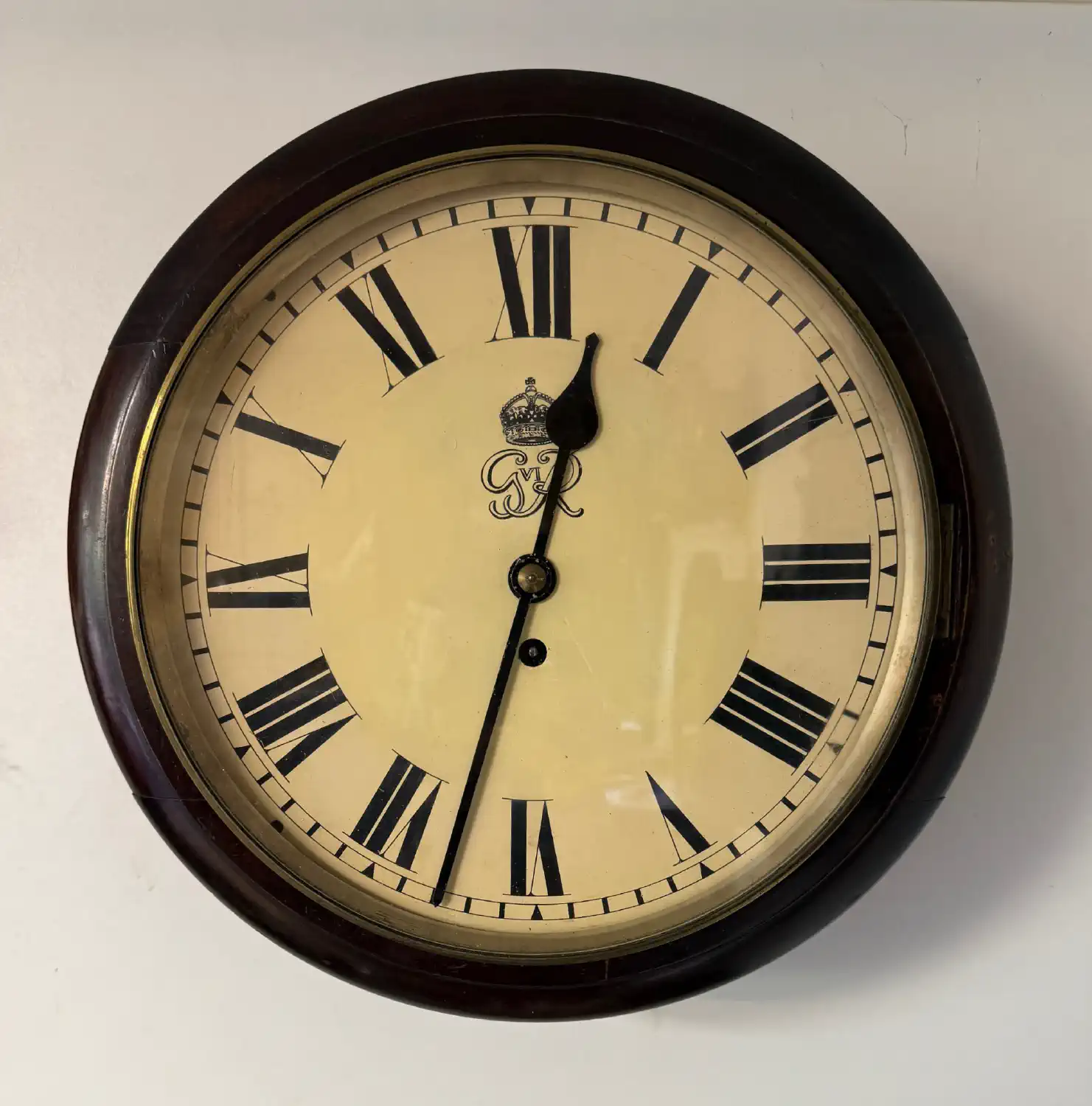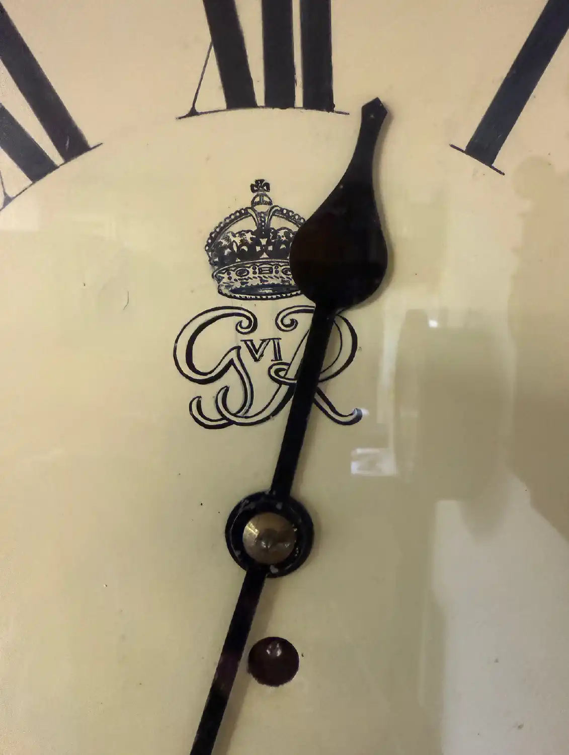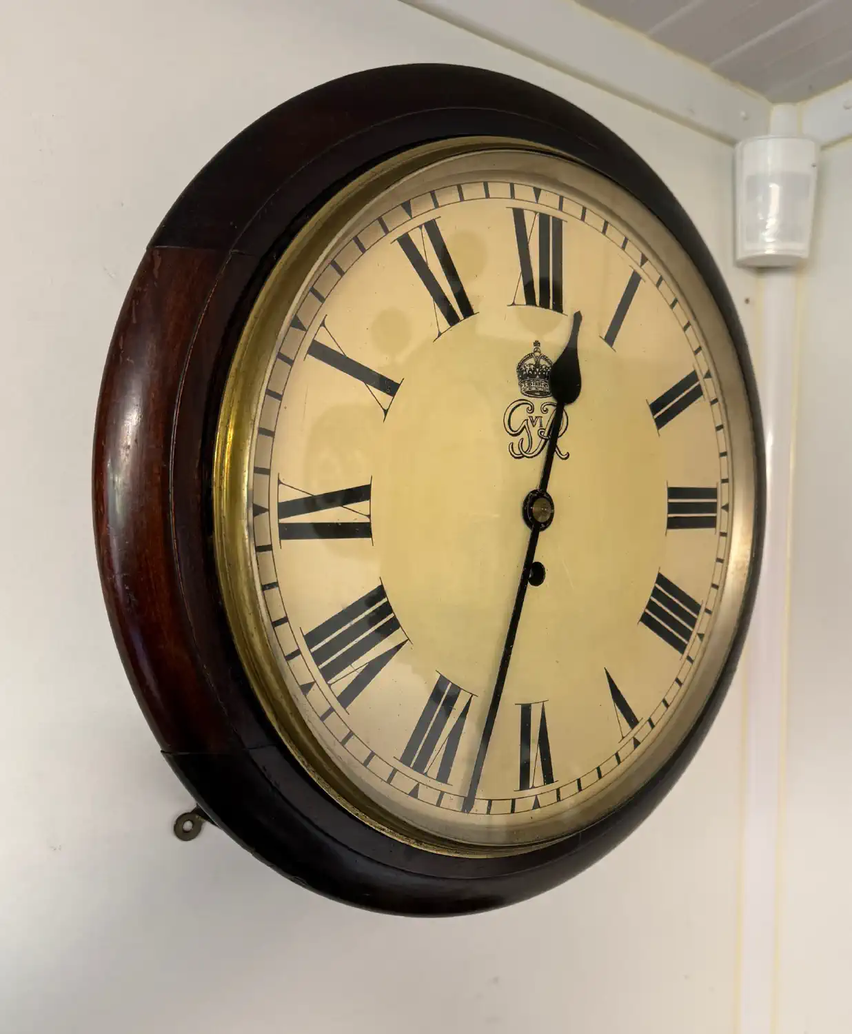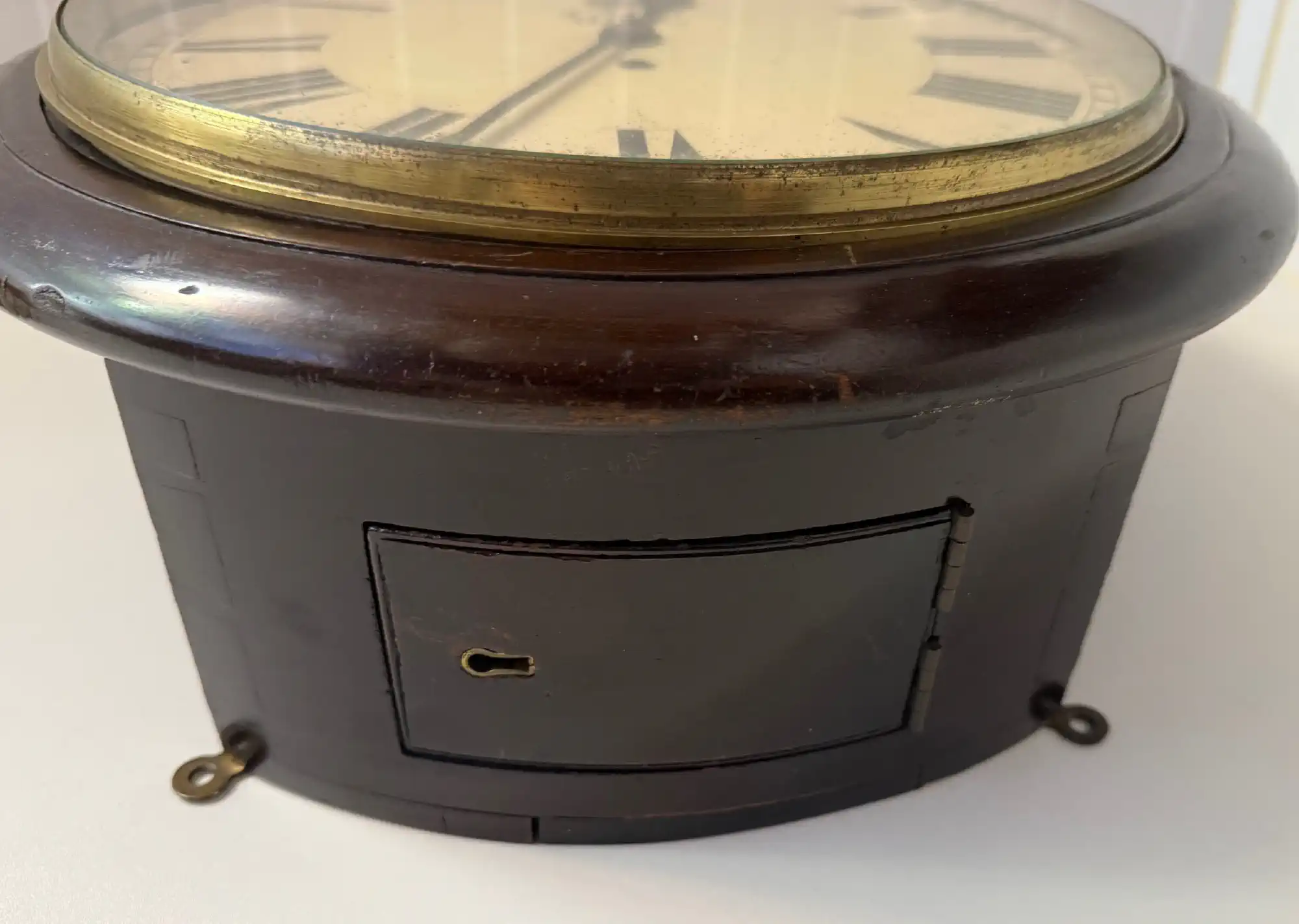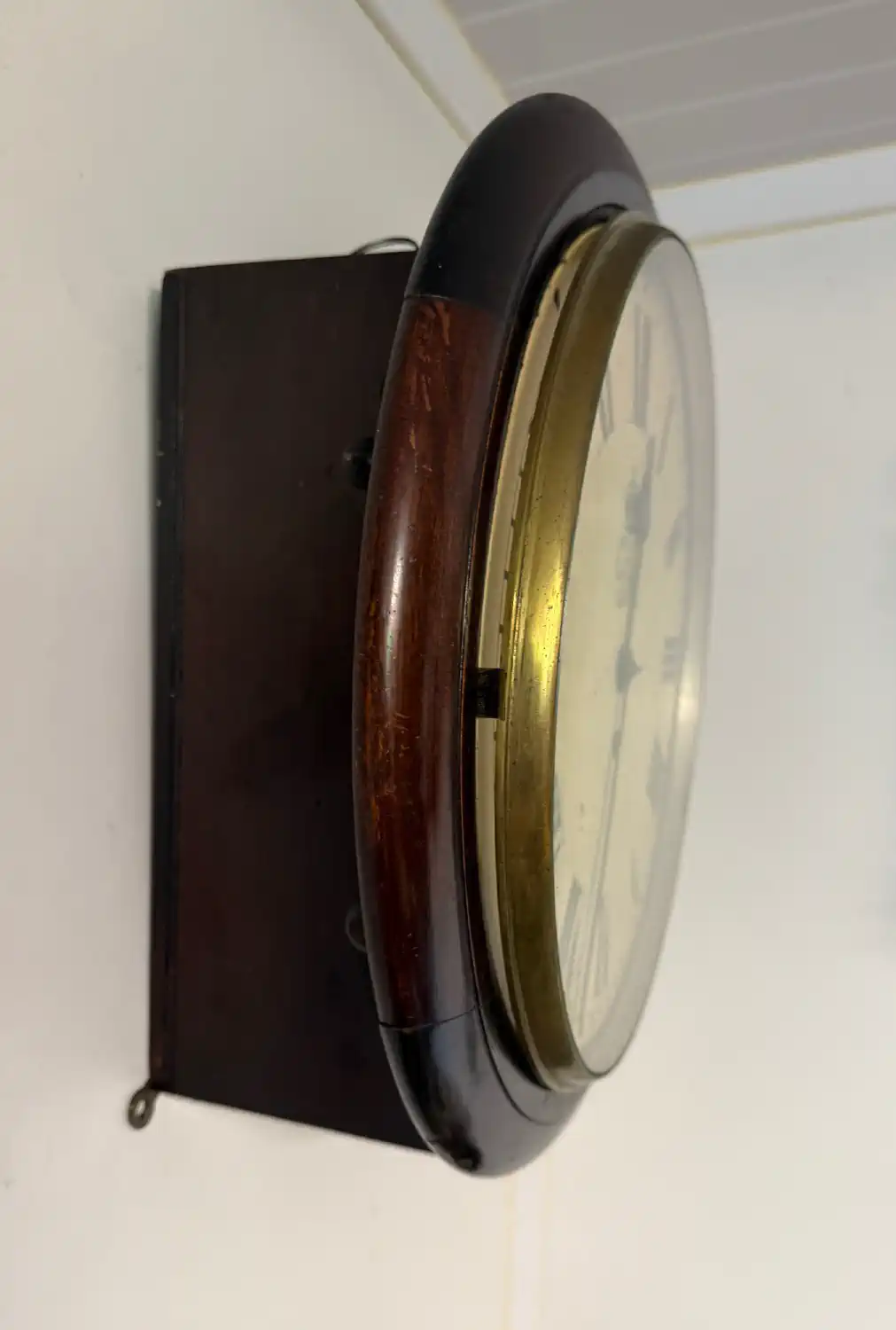 A lovely and attractive English dial clock, made c. 1935-40. The mahogany case is of a classic design for a dial clock, which were used in many public building, schools, government departments and the like. There is a door to the side that gives access to the movement and one in the ottom to set the pendulum going The latter can be secured by a lock and key.