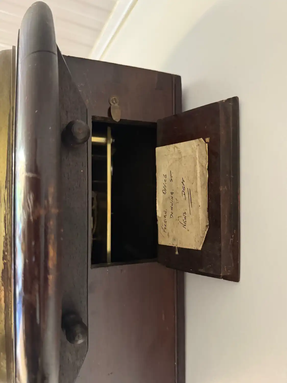 The 12-inch painted dial is protected by a glass door with a cast brass bezel. The time is indicated by a fine pair of spade hands on a black Roman chapter ring with five minute and minute divisions.